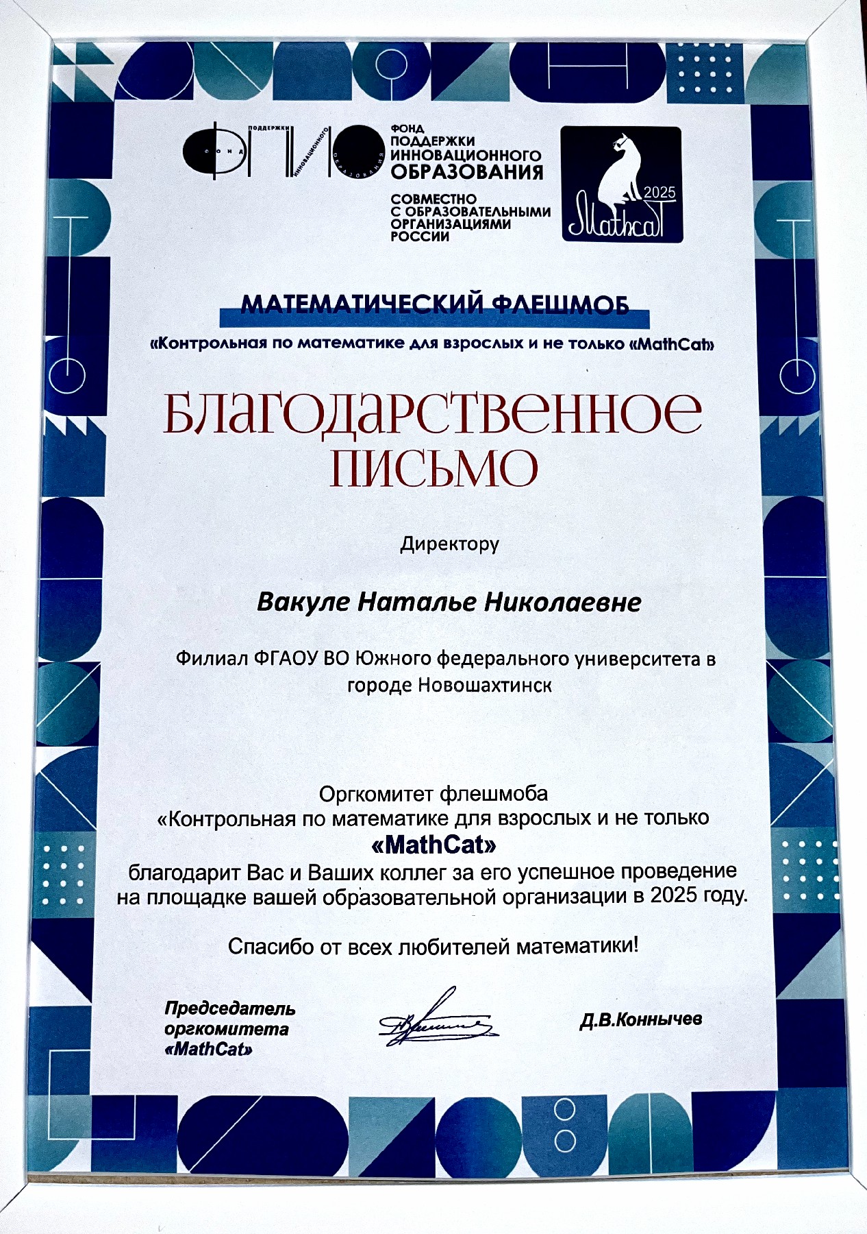 На имя коллектива филиала ЮФУ в г.Новошахтинске от председателя организационного комитета Всероссийского образовательно-развлекательного флешмоба «MathCat» Д.В. Коннычева поступило Благодарственное письмо: «Оргкомитет Всероссийского образовательно-развлекательного флешмоба «Контрольная по математике» «MathCat» благодарит вас за успешное проведение на площадке НШФ ЮФУ в 2025 году флешмоба по математике. Спасибо от всех любителей математики!».