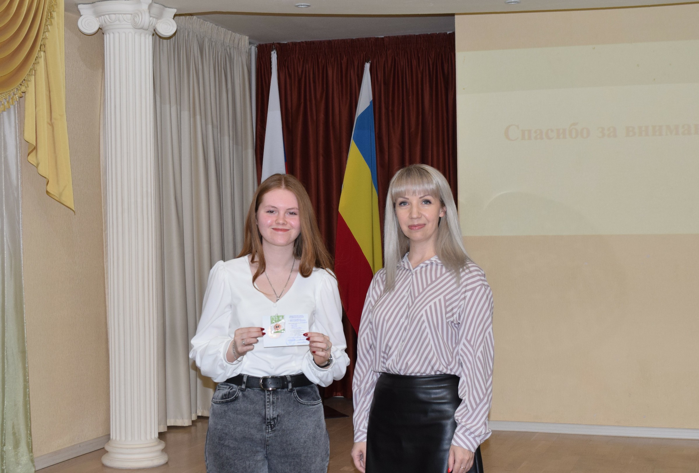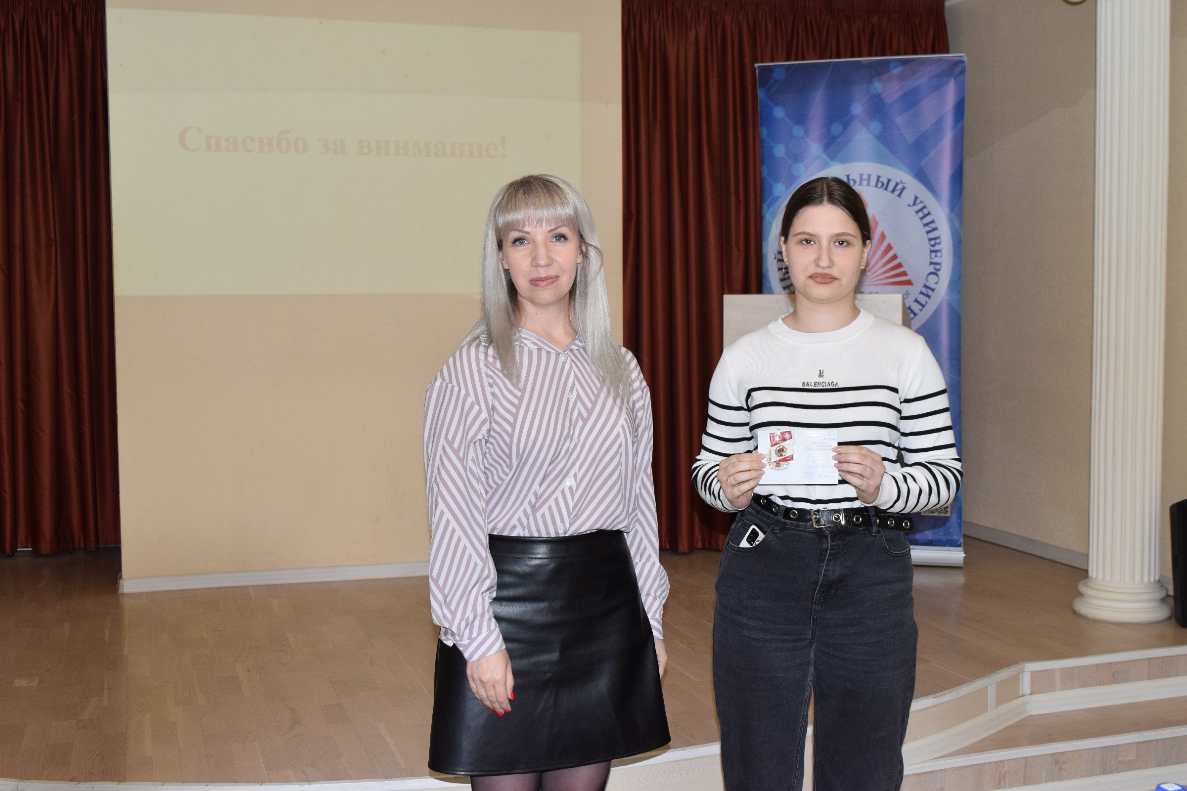 Бронзовые знаки отличия Всероссийского физкультурно-спортивного комплекса вручены студентам 2 курса направления Экономики - Сусанне Адамян, Софии Вагнер; Начального образования - Нелли Поповой, Вере Мостовой; Информатики и вычислительной техники - Дарье Вержбицкой, Яне Тимченко, Социальной работы - Кириллу Гетман.